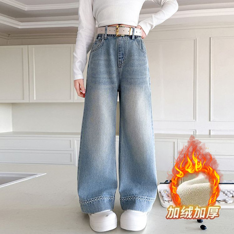 2025 Otoño/Invierno niñas Jeans terciopelo acolchado pantalones de pierna ancha para niños nuevas tendencias de talla grande Tidal invierno pantalones para niños