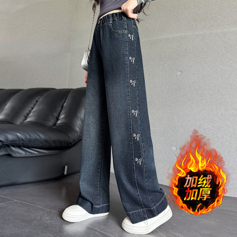 Nuevos pantalones y pantalones de invierno para niñas, terciopelo acolchado con lazo, pantalones vaqueros rectos, diseño de pierna ancha en estilo extranjero para niños