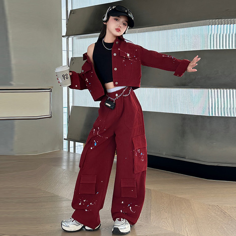 2025 niñas coreanas niños estilo extranjero renderizado Angola rojo Denim conjunto moda niñas primavera otoño traje patrón sólido